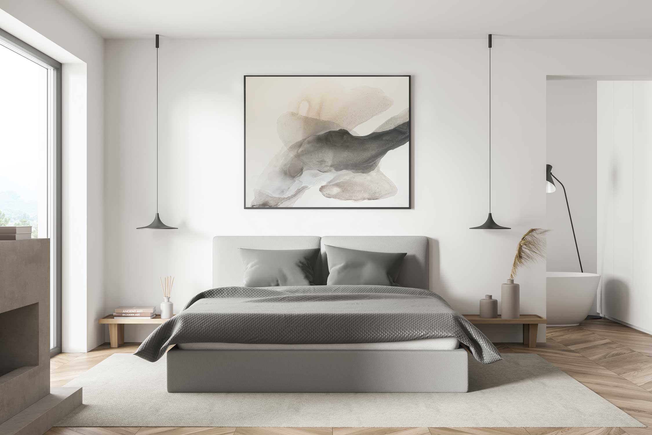 Akrylbläck och flytande akryl på handsträckt och grundmålad duk. Målningarna kommer uppspända på en kilram med en ståltråd baktill för att hänga upp tavlan. Ram ingår ej.